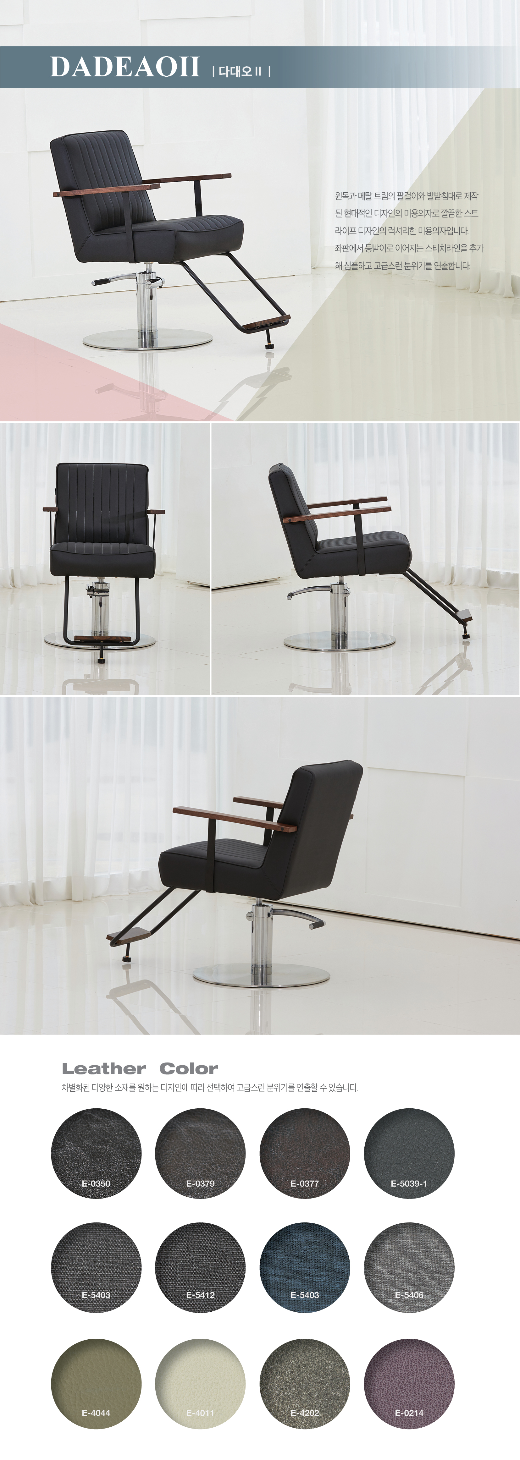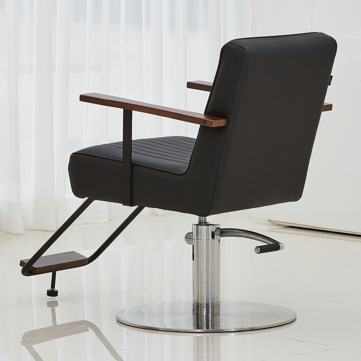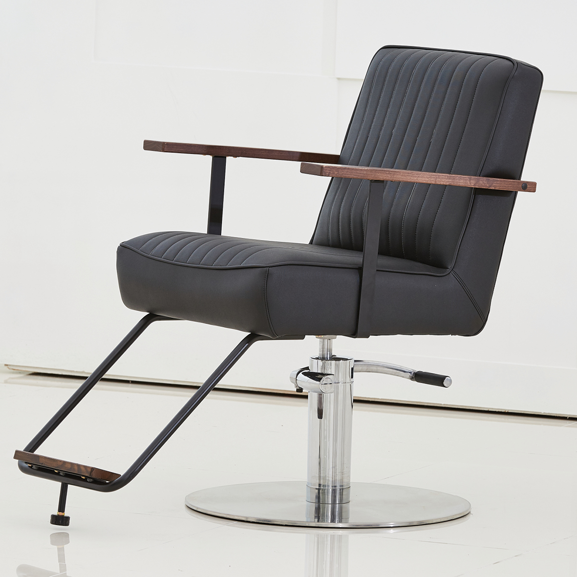 깔끔한 스트라이프 디자인의 등받이와 원목과 메탈 트림의 팔걸이로 제작된 현대적 디자인의 럭셔리한 미용의자입니다. 좌판에서 등받이로 이어지는 스티치라인을 추가해 심플하고 고급스런 분위기를 연출합니다.