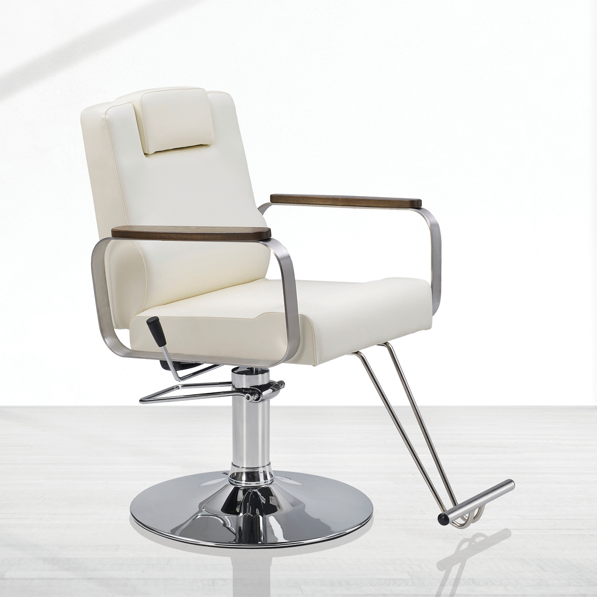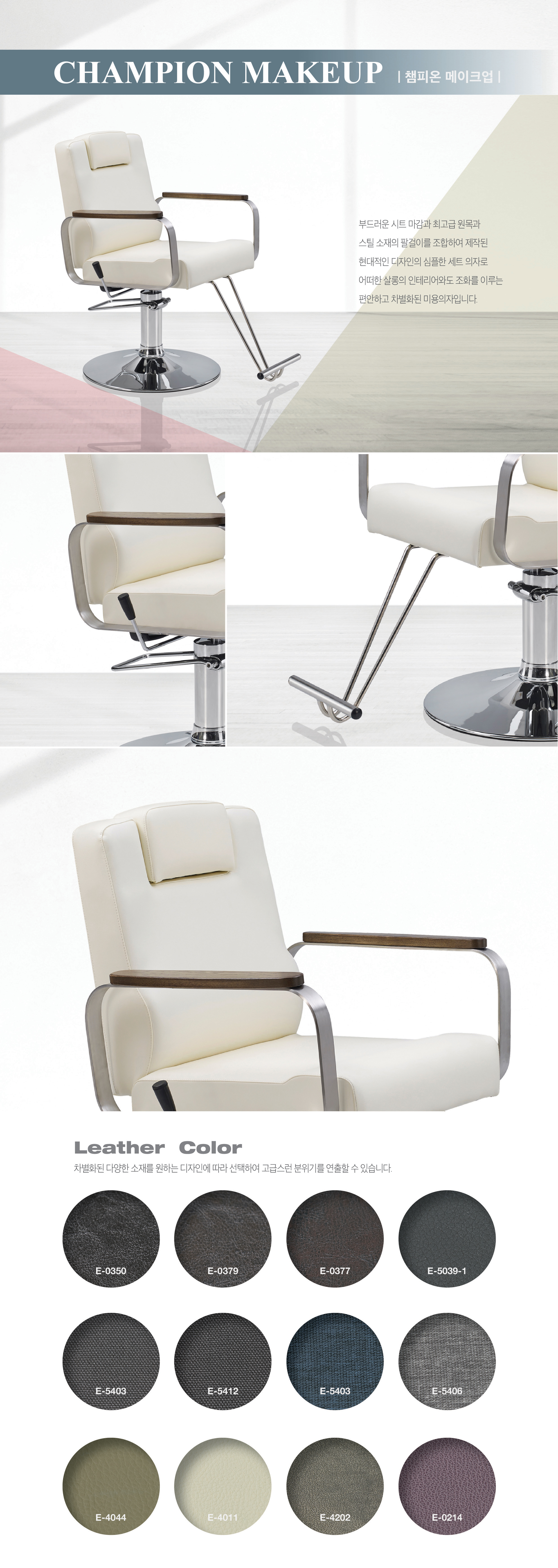 부드러운 시트 마감과 최고급 원목과  스틸 소재의 팔걸이를 조합하여 제작된  현대적인 디자인의 심플한 세트 의자로  어떠한 살롱의 인테리어와도 조화를 이루는  편안하고 차별화된 미용의자입니다.
