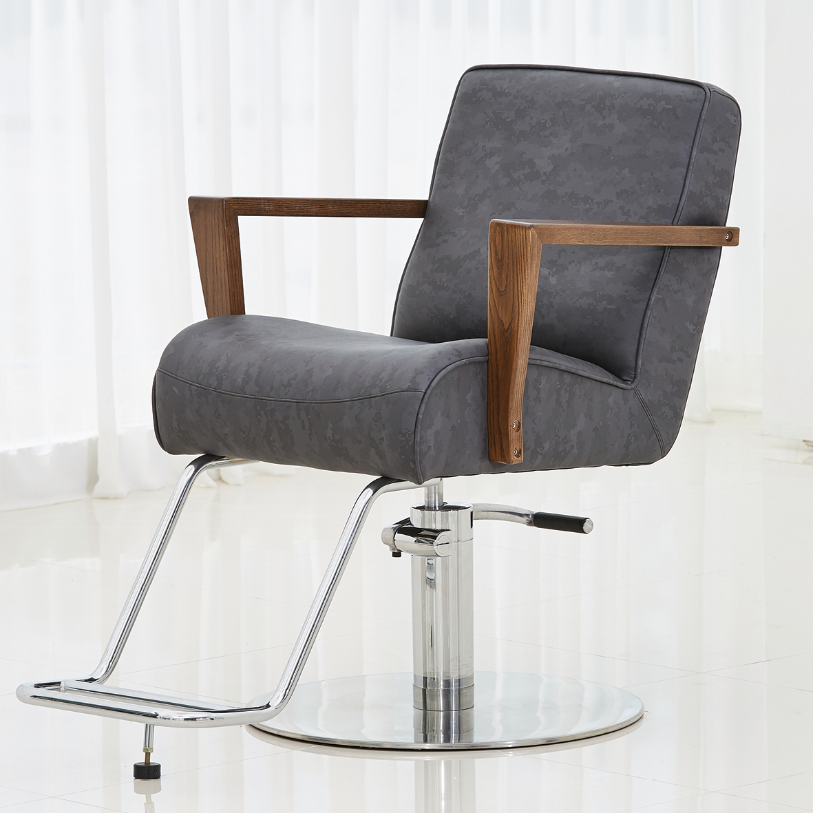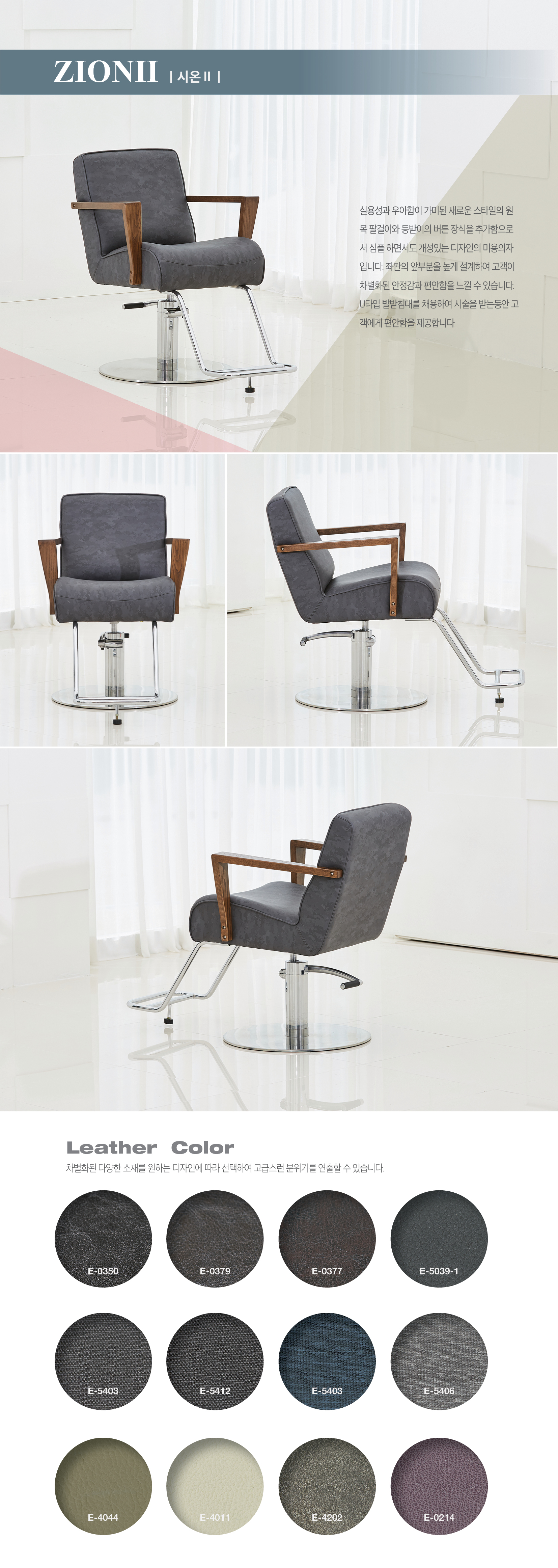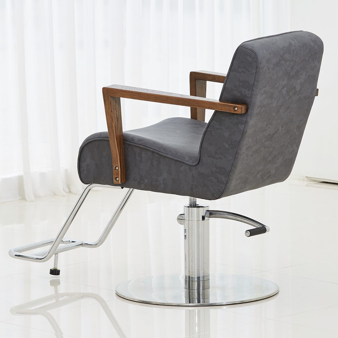 실용성과 우아함이 가미된 새로운 스타일의 원 목 팔걸이와 등받이의 버튼 장식을 추가함으로 서 심플 하면서도 개성 있는 디자인의 미용의자 입니다.